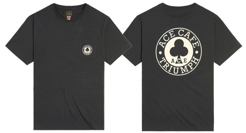 Soft 100% cotton tee in black, with a classic patch pocket bearing printed Triumph X Ace Cafe logo to the chest, and larger logo on the reverse.