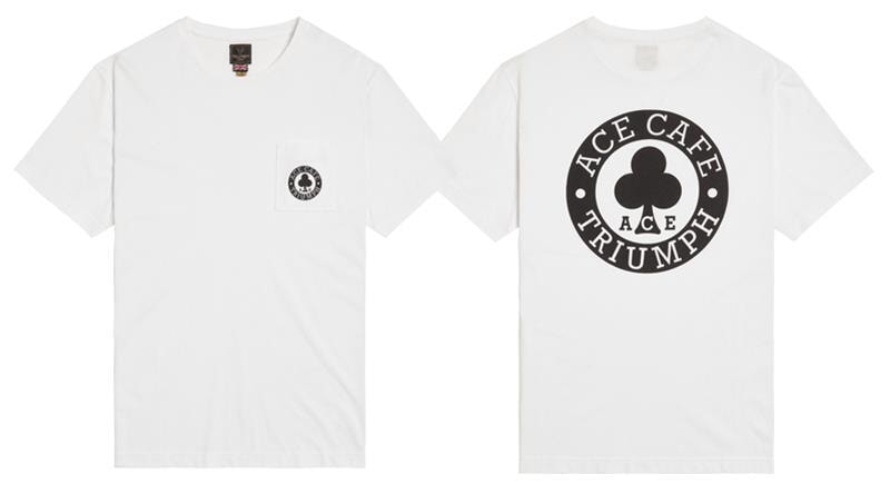 Soft 100% cotton tee in white, with a classic patch pocket bearing printed Triumph X Ace Cafe logo to the chest, and larger logo on the reverse.