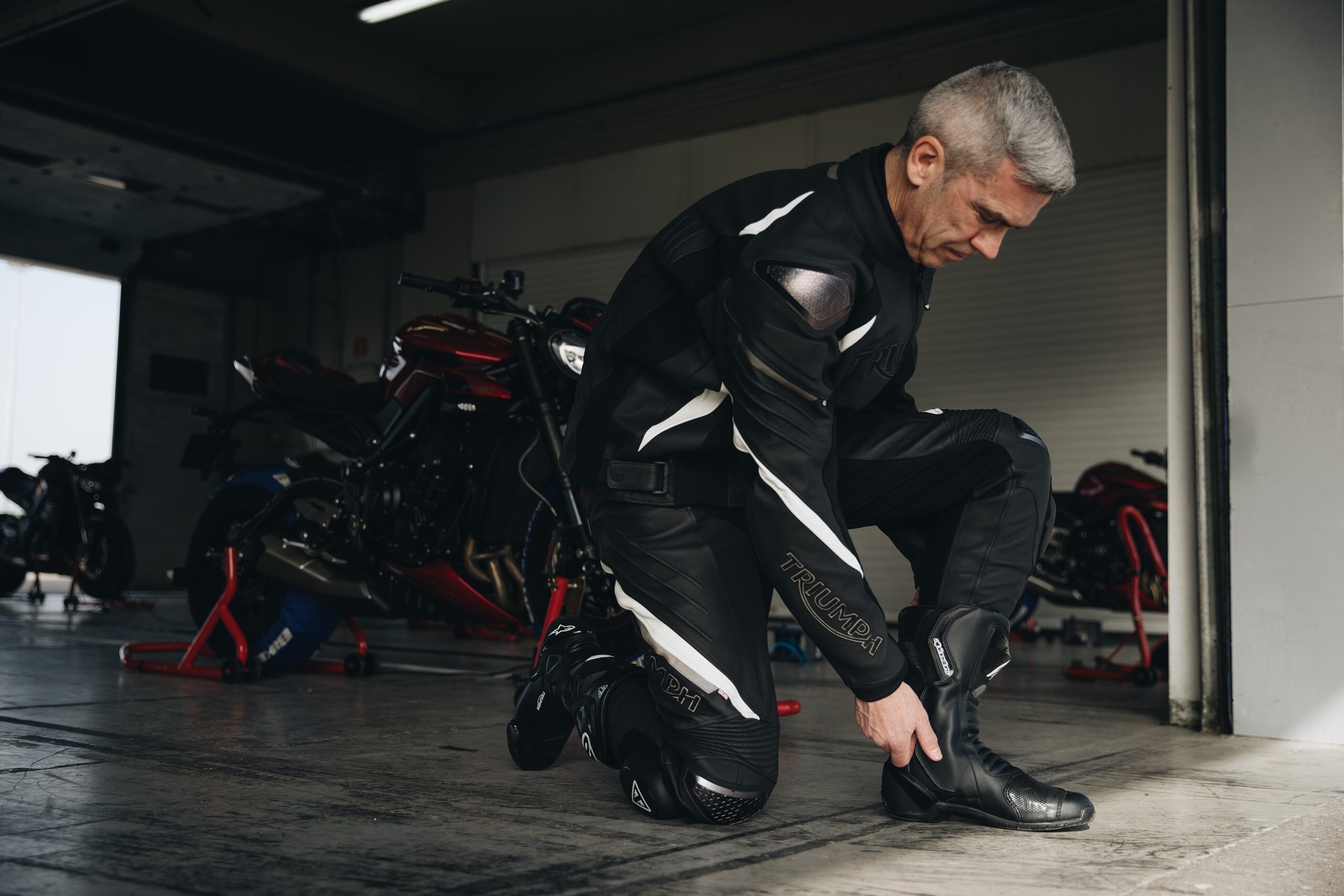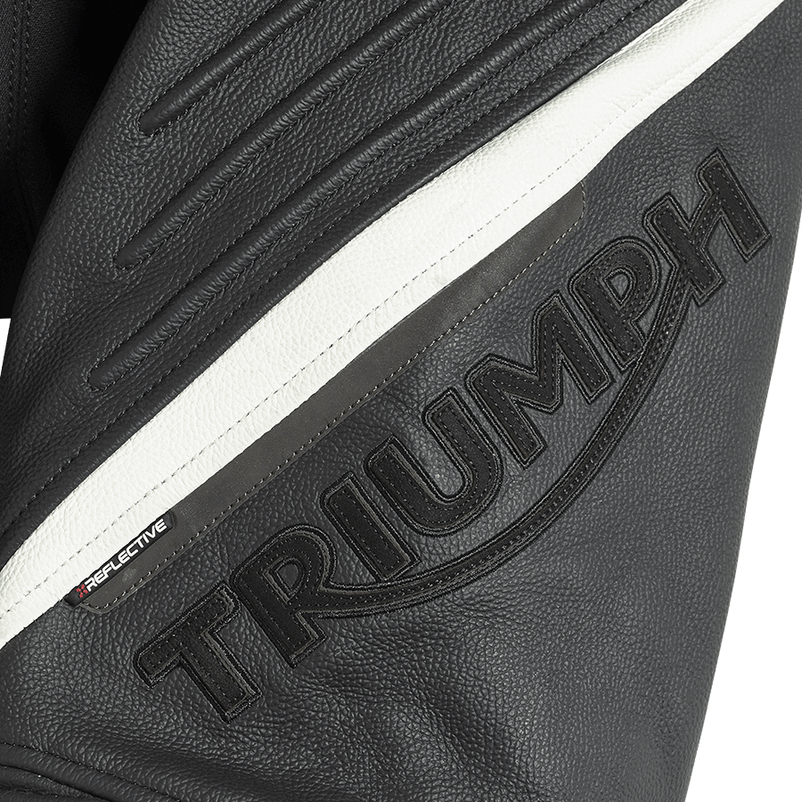A new and upgraded Triple Leather Jean featuring a sports leather construction with TFL coating to reflect heat and keep the rider cool, and TriStretch fabric inserts for ultimate fit and comfort. This new iteration offers improved protection, with the new ultra-lightweight D3O® Ghost hip and integrated hard-moulded knee armour, along with removable and replaceable Triumph branded Knee Sliders. The jean is designed to be worn with the Triple Leather Jacket, connecting with a long connection zip to create the ultimate 2-piece suit.