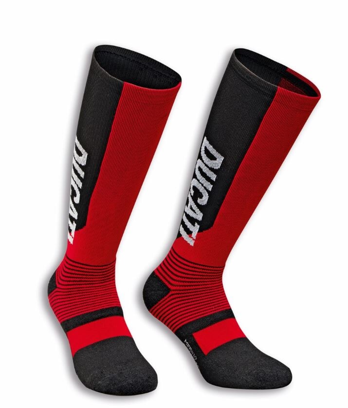 Technical socks conceived to guarantee maximum thermal comfort, even in colder climates. The merino wool used for the foot area ensures warmth and excellent breathability, without retaining sweat. The optimized design features reinforced areas, specifically conceived for motorcycle use, maximizing comfort and practicality. The perfect ally for the Ducati enthusiasts who can't do without their fun and adrenaline even in winter.