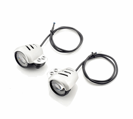 A pair of LED fog lights with clear anodised aluminium shrouds with cut out detailing.