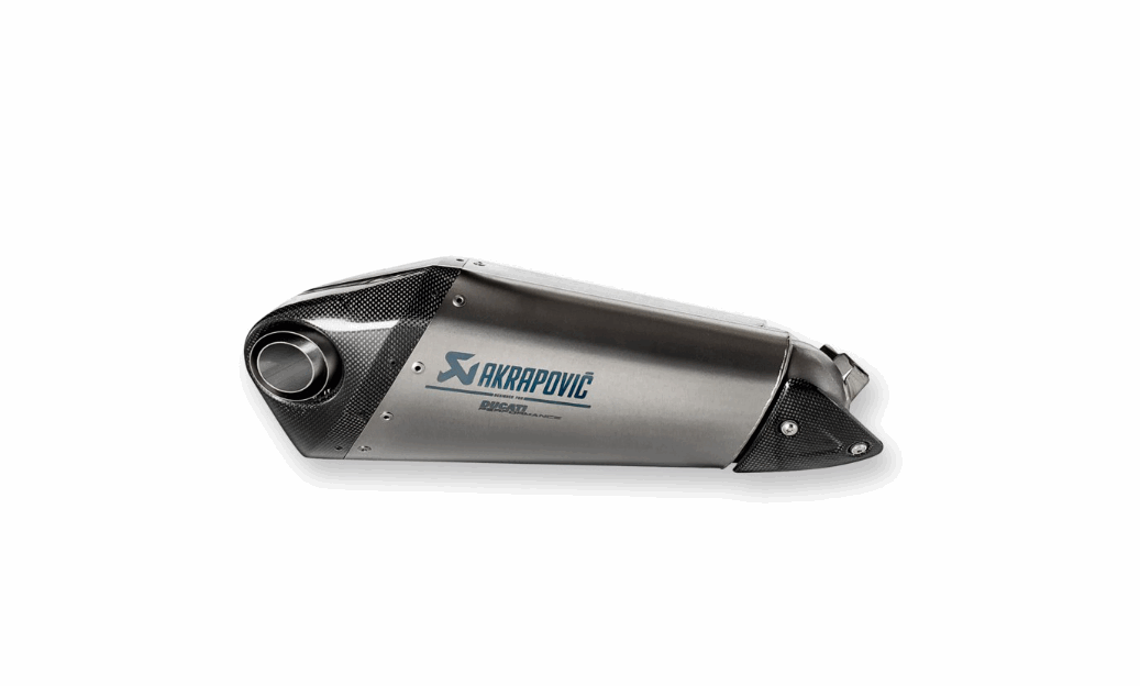 Ducati-designet er kombinert med Akrapovič sitt dyktige håndverk for å få maksimalt ut av et slip-on-system. Eksosanlegget er laget helt i titan og utviklet i samarbeid med Ducati Corse. Det formidler all råskapen til Panigale og gir, i tillegg til en betydelig økning i dreiemoment og effekt, også en vektreduksjon sammenlignet med standardeksosen. Anlegget leveres med et dedikert motoroppsett som oppfyller spesifikke racingkrav og sikrer maksimal ytelse.